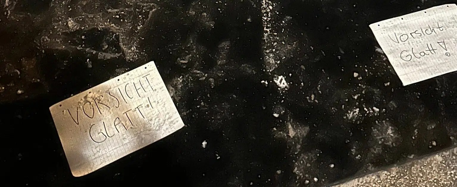 Um kleine oder auch große Unfälle zu vermeiden, hat sich in Köln jemand etwas ganz Besonderes überlegt. Auf Din-A4 Blättern schrieb sie: “Vorsicht Glatt”.